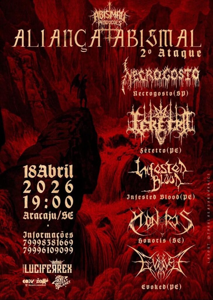 Desta forma, a *Abismal Produções* desenvolve em Aracaju-se, *Aliança Abismal 2° Ataque*, convocando as hordas *Necrogosto*, *Honoris*, *Féretro*, *Infested Blood* e *Evoked*,