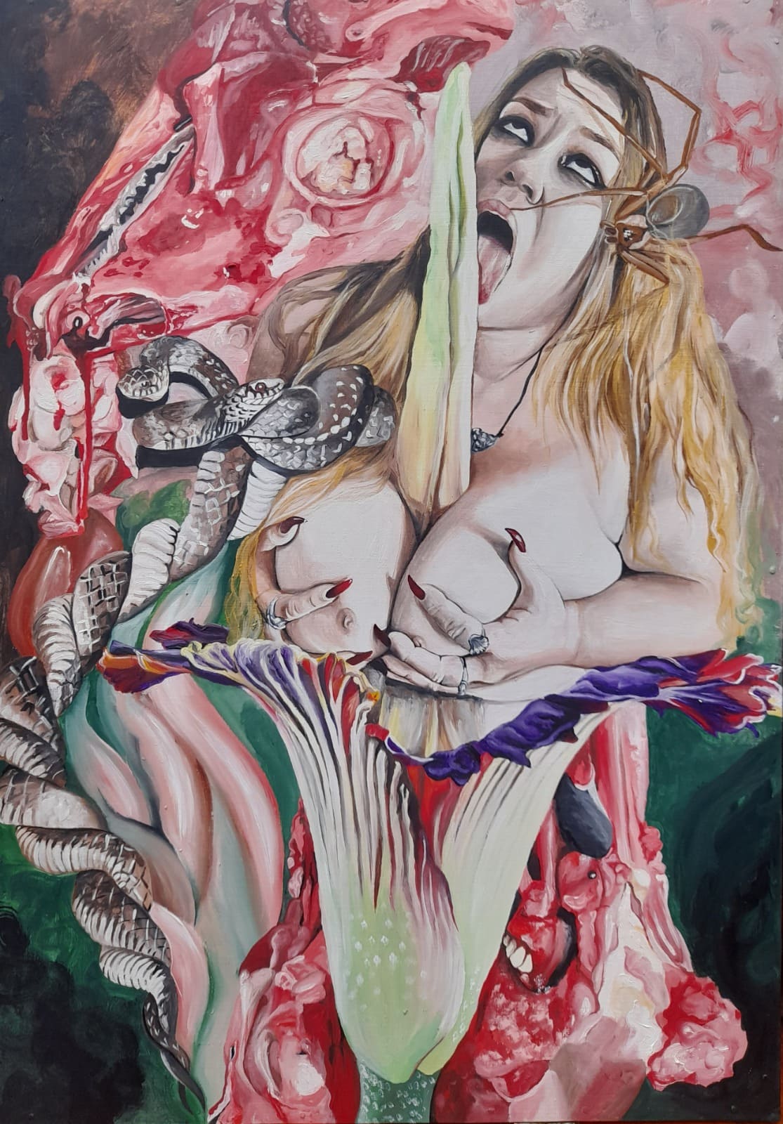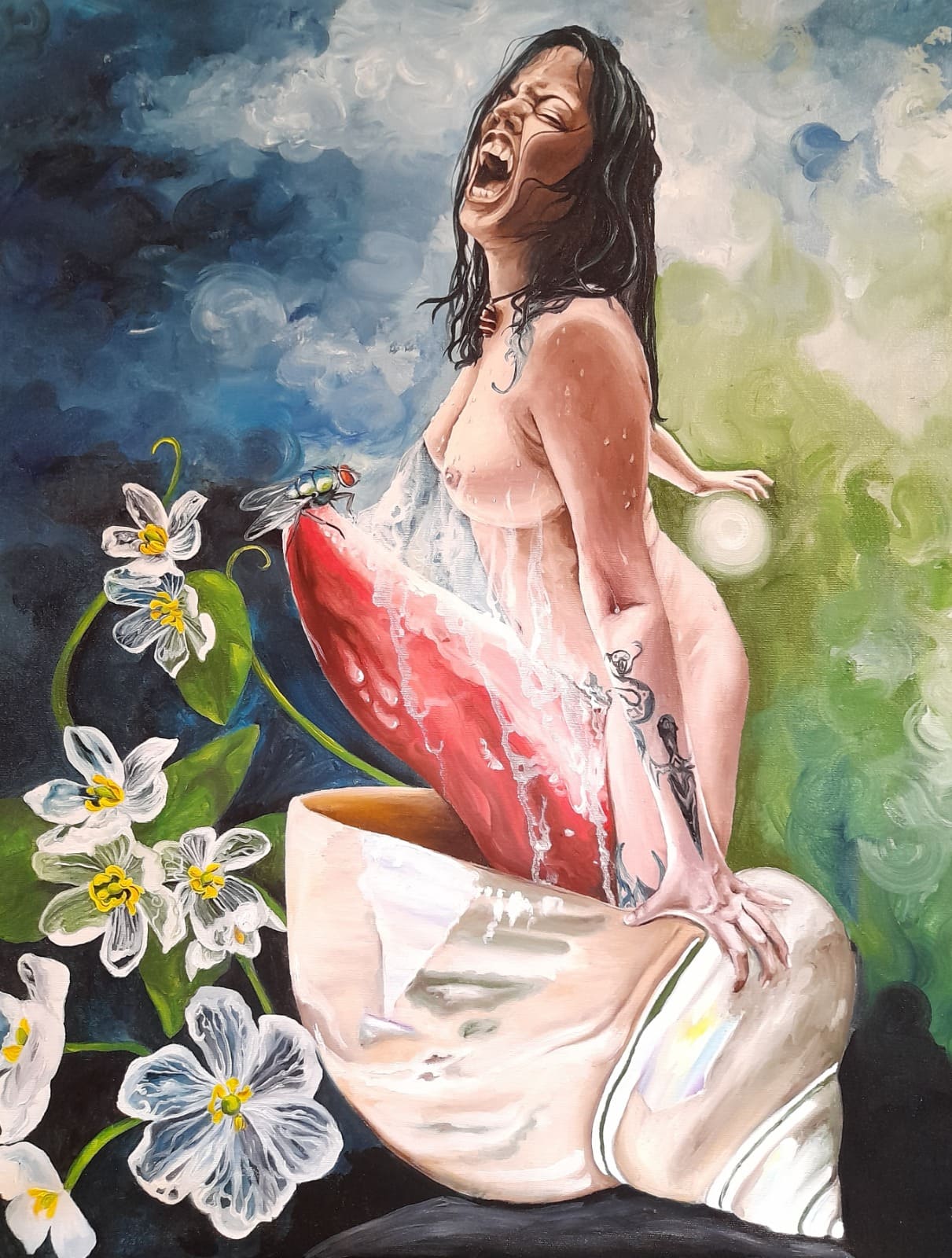 Suas pinturas apresentam a dualidade humana através da interação dos elementos criadores e destruidores da natureza. Veneno e cura, sexo e morte, dor e prazer, por exemplo.