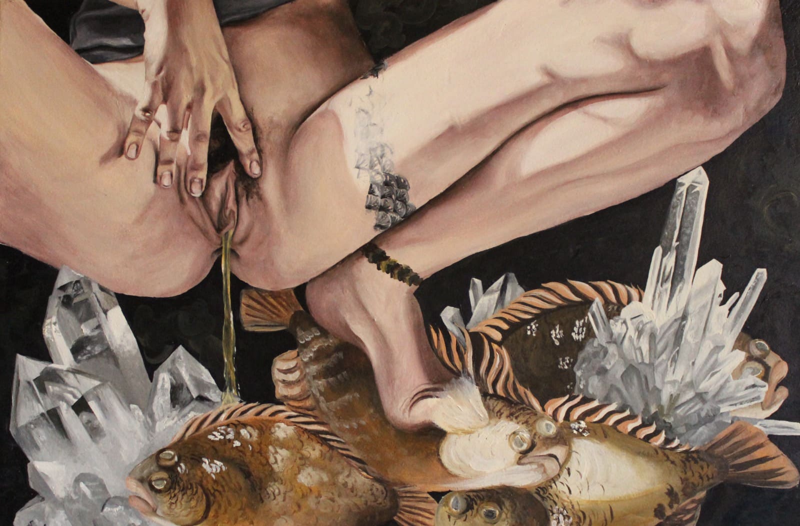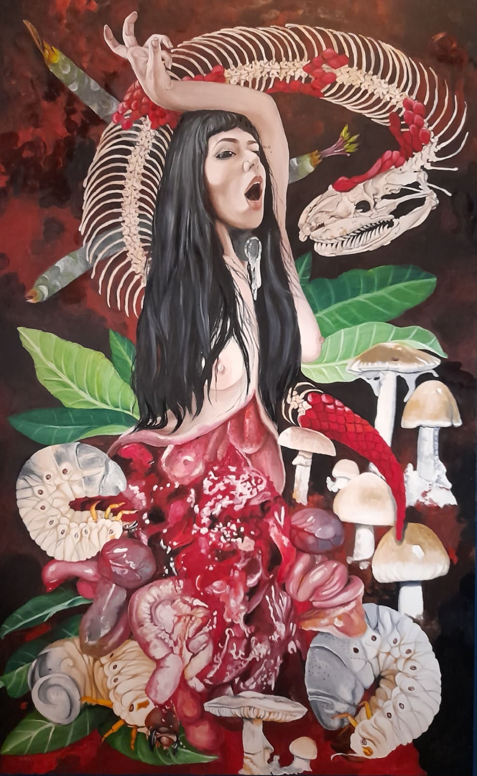 Suas pinturas apresentam a dualidade humana através da interação dos elementos criadores e destruidores da natureza. Veneno e cura, sexo e morte, dor e prazer,  por exemplo.