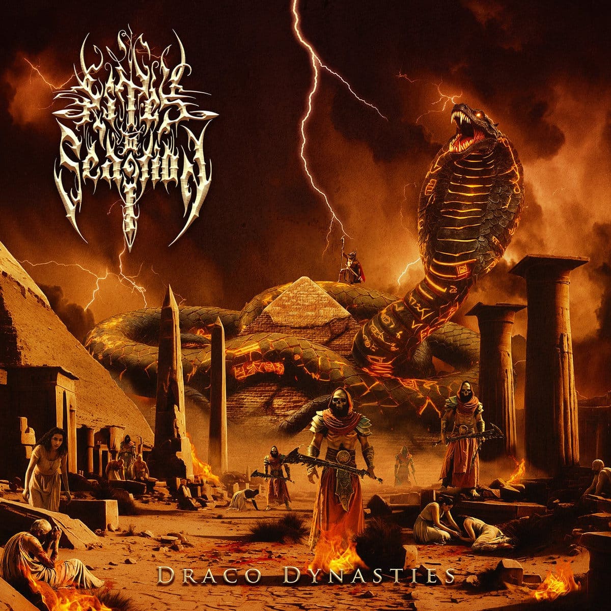 A faixa-título, “Draco Dynasties”, é inspirada no mito egípcio, onde Hórus trava uma guerra contra Set para vingar seu pai e restaurar a ordem. “Blood Sworn” narra a vingança de Drácula contra a igreja, transformando a dor em terror e ecoando pelas lendas amaldiçoadas da Romênia. Em “Solstice of the Condemned”, a escuridão do ano 536 d.C. desce, após a erupção que ocultou o sol e destruiu civilizações.