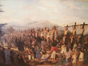 Assim como a todos os continentes do planeta, no século XVI houve uma expansão marítima massiva realizada pelos europeus com desejos de exploração e de imposição cultural aos demais espaços, assim como a África, a Asia não ficou de fora desse intento, foi nesse período que os portugueses chegaram a ilha japonesa através dos missionários jesuítas (os mesmos que chegaram em terras brasileiras e fizeram os mesmos processos). Houve uma sensível diferença da atuação dos jesuítas em terras japonesas com relação a sua atuação em terras brasileiras, principalmente quanto a resistência cultural que houve do povo japonês. Muitos se converteram convencidos pelos jesuítas portugueses, mas depois de algum período o cristianismo passou a ser uma religião proibida no território no século XVII, mais precisamente em 1612. Os jesuítas não foram os únicos a tentarem a conversão do gentil japonês, os espanhóis também chegaram ao Japão com as companhias de franciscanos e dominicanos.