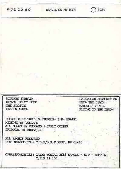 Em 1984 foi gravada a demo que é o objeto dessa matéria: “Devil on My Roof”. A demo contava com 08 faixas, todas em inglês, curiosamente, não contendo dois dos maiores clássicos do VULCANO: Guerreiros de Satã e Total Destruição. Curiosamente também, Johhny Hansen, a faísca da transição do metal mais clássico pro metal extremo, gravou apenas essa demo. E as curiosidades não param por ai: Pelo que consta, essa demo contou com apenas 05 – CINCO! – cópias, sendo uma material criado apenas para envio para alguns selos e mídias especificas.